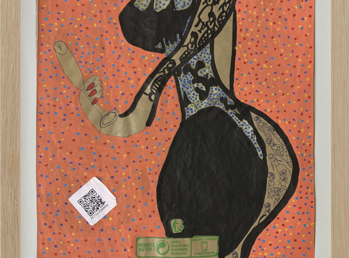 Son art, mêlant dessin, collages, peinture et performance, dénonce le consumérisme et les clichés véhiculés sur les femmes. Sa série sur des sacs en papier kraft contraste la vie kinoise et parisienne tout en racontant les luttes des femmes immigrées.
